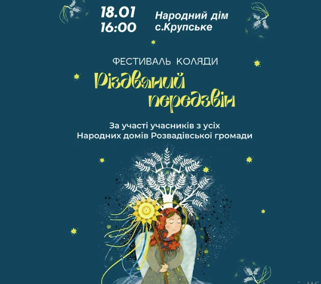 Різдвяний передзвін Опубліковано 15.01.202615.01.2026 osvita 18 січня 2026 року о 16:00 год в Народному домі села Крупське відбудеться фестиваль коляди “Різдвяний передзвін” за участю колективів Народних домів Розвадівської територіальної громади. Поширити